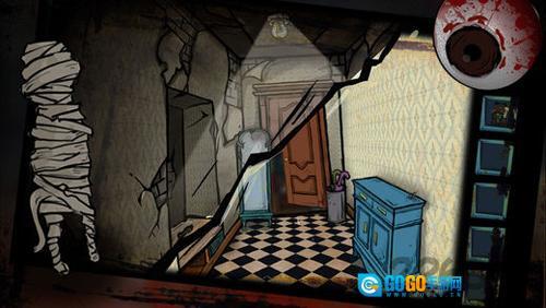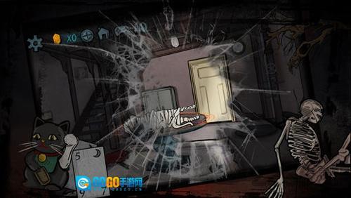 2. 用锤子敲碎镜子(此处有高能场景,请注意),得到镜子碎片。随后转身返回门前,点击门下方的长方形面板。