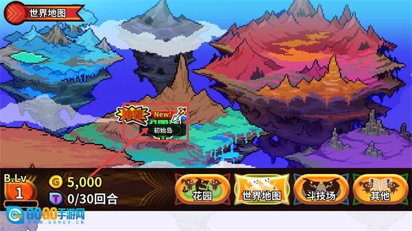 3、在【世界地图】界面找到【初始岛】,目前【B-lv-1】拥有【5000】金币,能够通过【花园】【世界地图】等按钮开启后续的冒险。