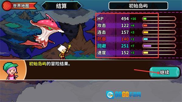 1、完成【初始岛屿】的冒险并进入结算界面后,能看到【HP-494+16】【攻击-122+4】这类属性增长情况,点击【继续】按钮即可推进后续流程。