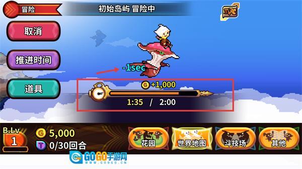 4、当处于【初始岛屿-冒险中】状态时,可借助【推进时间】功能来加快进度(当前进度为【1:35/2:00】),同时还能获得【+1000】金币,也可根据自身需求使用【道具】进行辅助。