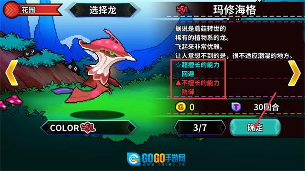2、选择【玛修海格】这只由蘑菇转世而来的植物系龙时,要留意它擅长【回避】、不擅长【防御】的特点,在确认【COLOR-红】【3/7】后点击【确定】即可完成选定。