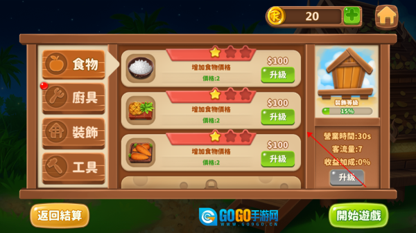 6、在次日营业开始前,可对食物、厨具、装饰、工具等进行升级,从而获取更高的利润