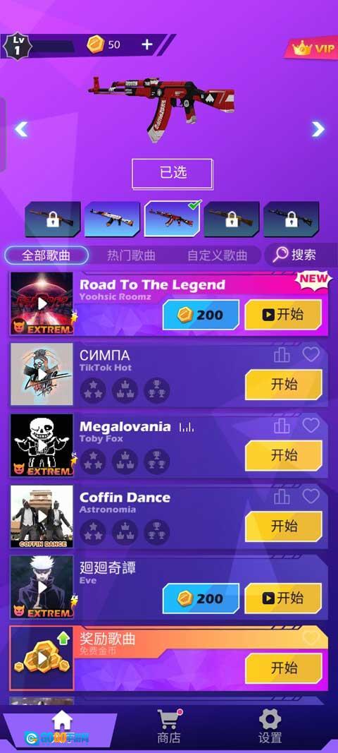 4、玩家可以在商店中购买自己喜欢的枪皮肤,将枪击和音乐相结合,就能用自己喜欢的枪支开始射击啦。