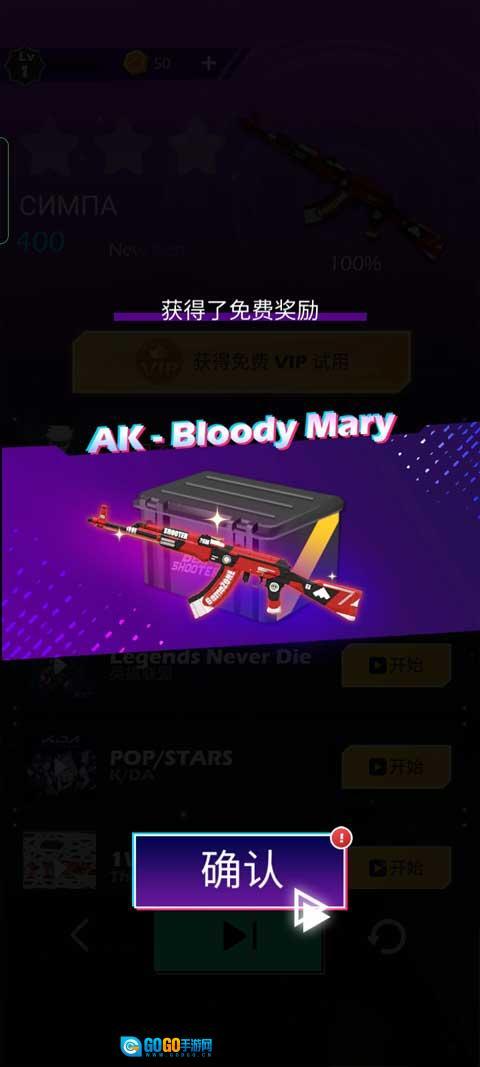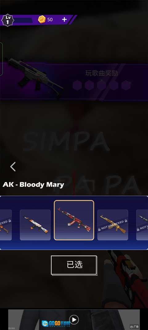 6、选择好歌曲之后,选择接下来射击用的枪支皮肤,选好后进行下一步。