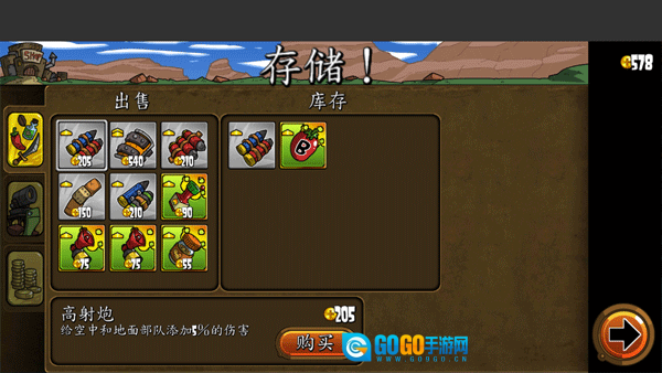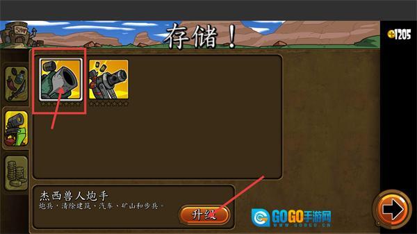 1、在存储界面选中【杰西兽人炮手】,该单位属于炮兵类型,能够对【建筑、汽车、矿山、步兵】进行清除;点击【升级】按钮可增强其作战能力,从而提升关卡中的输出效果。