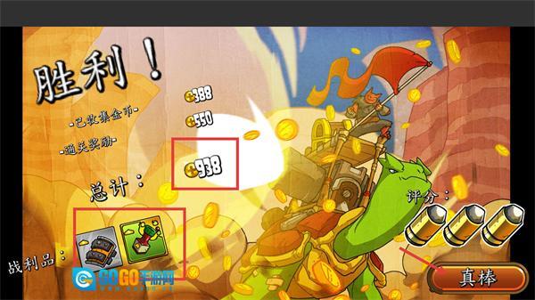 4、通关后可获取【已收集金币-388】和【通关奖励-550】,总共得到【938】的资源与战利品,点击【真棒】按钮即可完成结算。