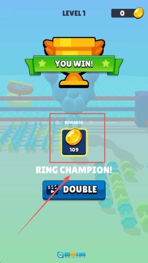 4、胜利领奖环节:界面会显示“LEVEL1 YOU WIN! 109 RING CHAMPION!”,点击“DOUBLE”按钮可使奖励翻倍。