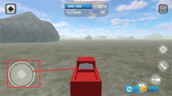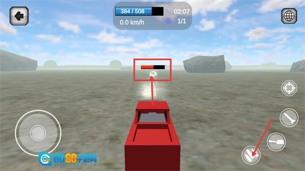 进入驾驶场景后,用左侧摇杆操控车辆移动,注意观察顶部显示的【508/508】状态数值,右侧的功能按钮能对当前场景的操作起到辅助作用。