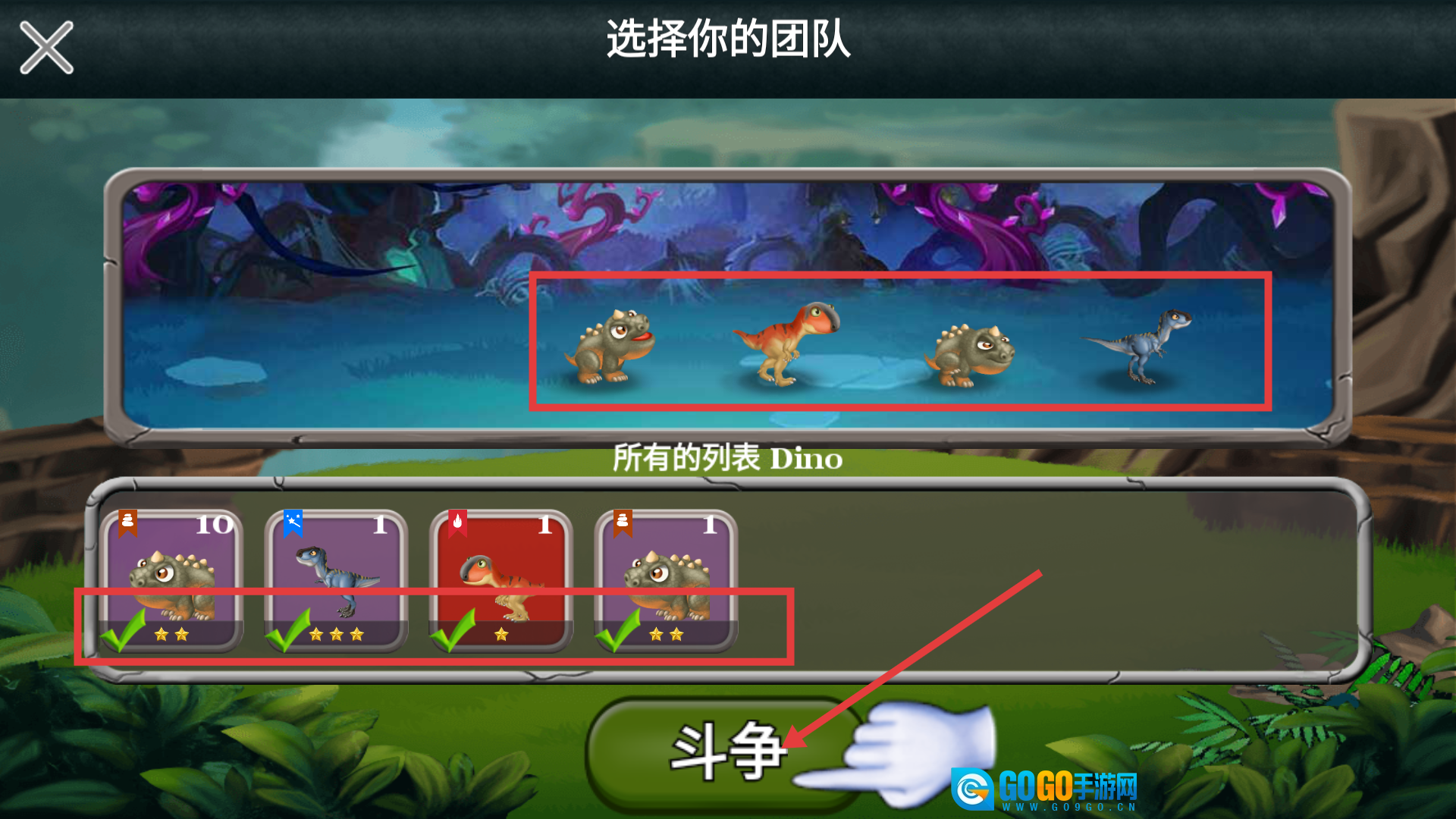 2、进入【选择你的团队】界面后,先挑选恐龙组建队伍,接着点击【斗争】按钮就能开启战斗,向对手发起挑战。