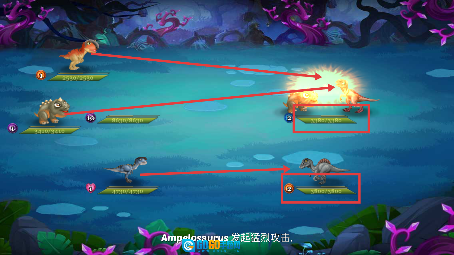 3、战斗时可借助己方恐龙(例如Ampelosaurus)展开攻击,建议优先锁定敌方血量显示为【3380/3380】和【3800/3800】的恐龙,以此实现高效取胜。