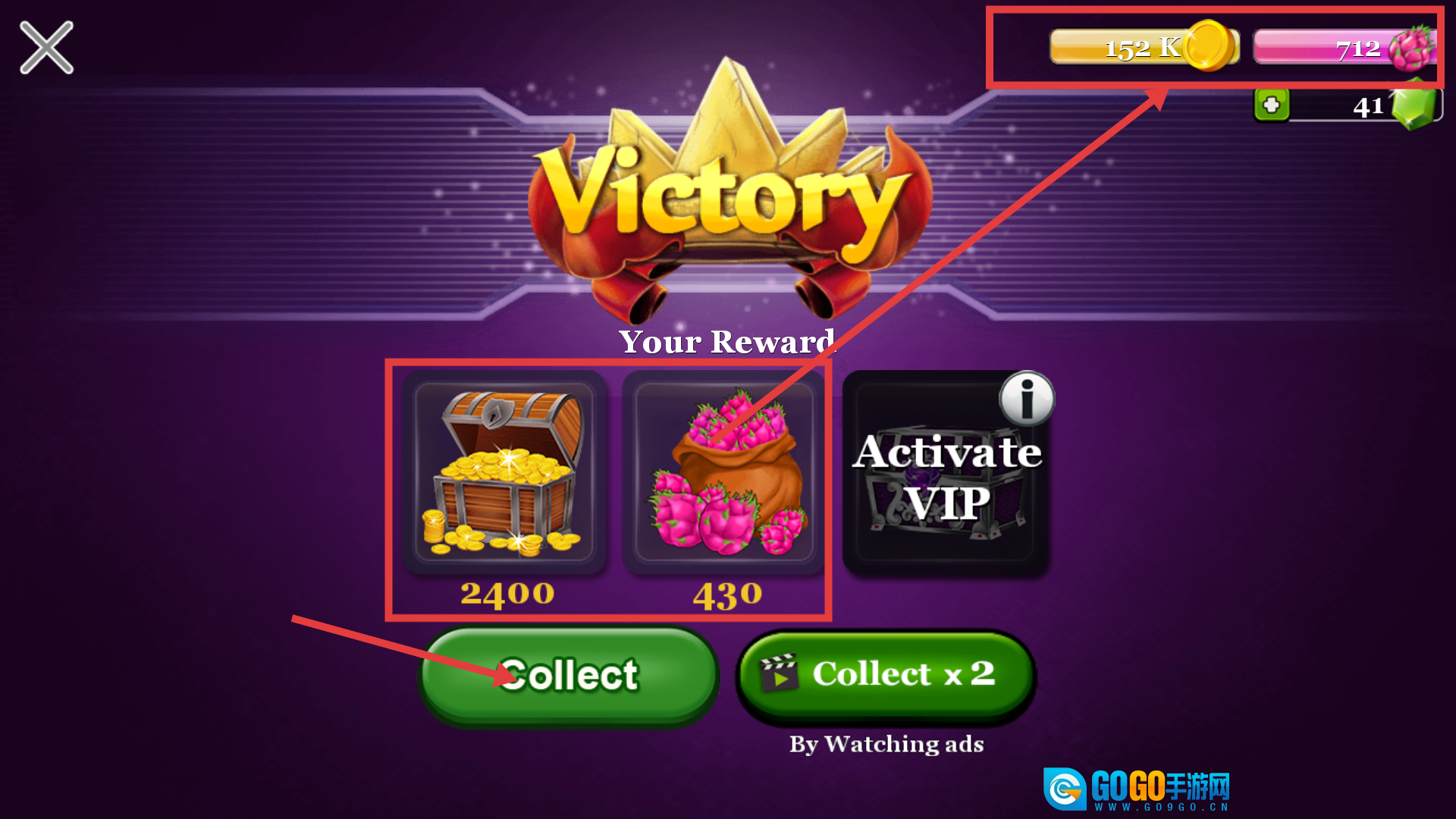 4、战斗获胜后,点击【Collect】按钮即可领取【金币-2400】【火龙果-430】等奖励,这些资源可用于积累起来提升恐龙的战力。
