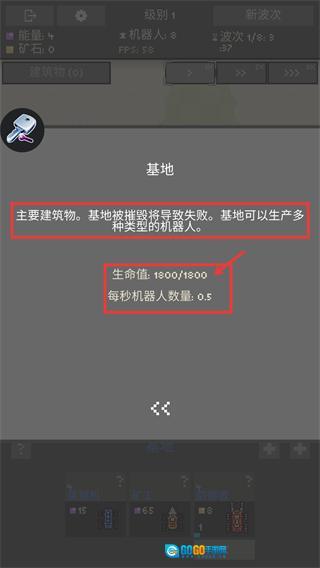 2、守护【基地-生命值1800/1800】,作为核心建筑物,它能制造各类机器人,每秒钟产出0.5个机器人,一旦基地遭到破坏,任务即宣告失败。