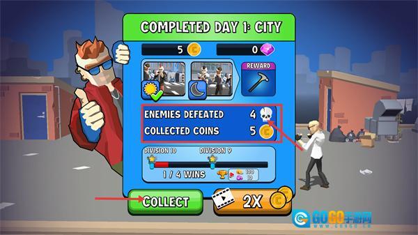 4、通过【Day-1-City】关卡后,战胜4个敌人并收集5枚金币,点击【COLLECT】按钮领取奖励,为接下来的战斗储备资源。