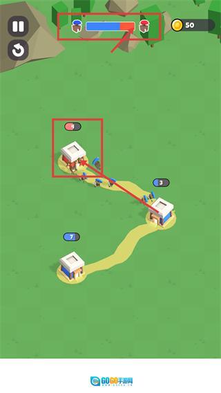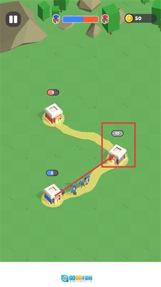 2、对战过程中,优先调配兵力进攻标有【10】的敌方建筑,沿路径推进战线,同时关注上方的对战进度条以掌握局势走向。