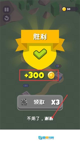 4、关卡胜利后可获得【+300】金币奖励,选择“不用了,谢谢”即可完成结算,积累的资源可用于后续关卡的建筑解锁。