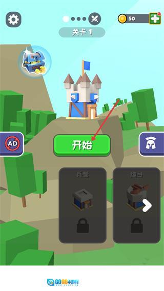 1、进入【关卡1】界面后,点击【开始】按钮开启挑战,当前持有【50】金币,【兵营】-【炮台】暂处于锁定状态需后续推进解锁。