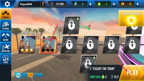 1、选择【关卡-2】并点击【PLAY】按钮开始游戏,此关卡设有时间限制,完成该关卡是为后续收集金币与钥匙奠定基础。
