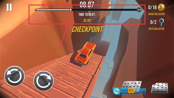 2、在关卡里要留意时间进度条,必须在35.00内抵达checkpoint,操控车辆时注意规划路径,确保时间进度能正常推进。