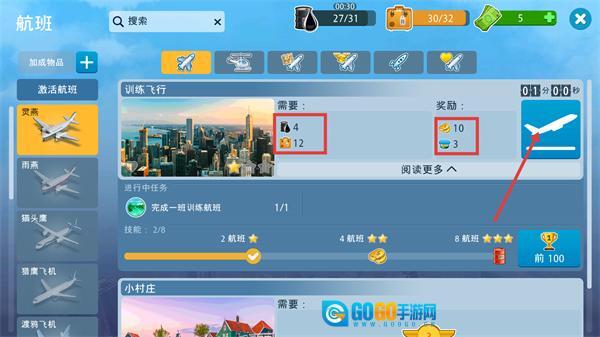 1、执行训练飞行航班,需消耗【4】份燃油与【12】名乘客,完成后可获得【10】枚金币等奖励,点击飞机图标即可开启飞行。