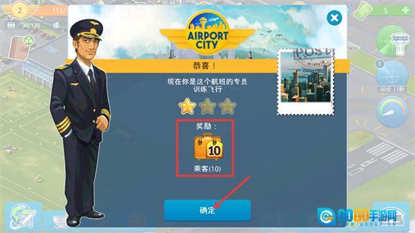 完成航班任务后,屏幕会弹出恭喜提示,点击【确定】按钮即可领取【10】名乘客的奖励,从而推进航班进度。