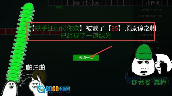 4、游戏结束后,可点击【再绿一次】继续挑战,查看【拱手江山讨你欢】被戴【35】顶原谅之帽的成果。