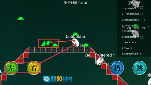 1、关注【剩余时间】和【排行榜】,通过下方的【方向】按钮操控角色,收集绿色道具,提升游戏表现。