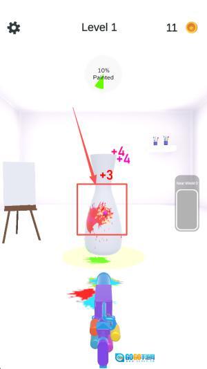 2、锁定射击目标:精准定位场景里的圆柱形建筑,调整射击的角度和速度,发射彩球来高效摧毁目标,推动任务进程。