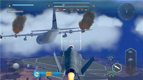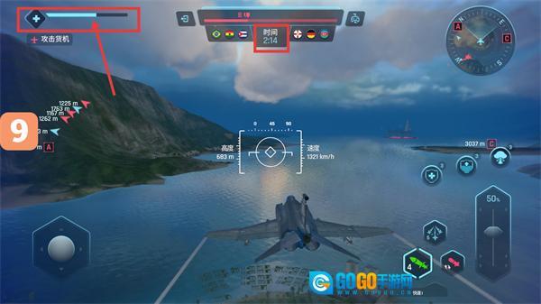 2、借助左侧操作区域操控飞机,按照右上角罗盘【A-B-C】的标识锁定敌人,参考高度与速度数据来精准靠近目标。