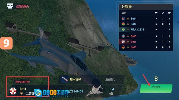 4、当被其他玩家击毁后,点击【立即重生】按钮即可快速回到战场,继续投身空战,争取提升分数板上的排名。