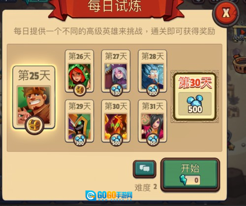 2.每日试炼 每日参与试炼可获得钻石奖励,连续挑战的天数越多,对应的钻石收益越丰厚;若成功完成第30天的挑战,还将额外解锁500宝石的专属奖励。