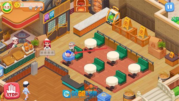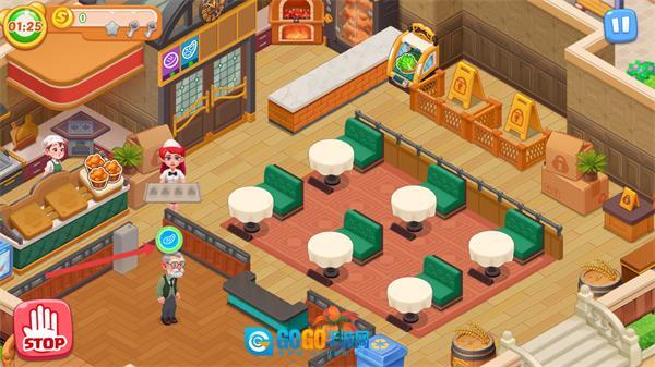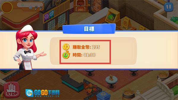 进入关卡后查看【目标】,需在【1分30秒】内赚取【235金币】,为餐厅营业做准备。