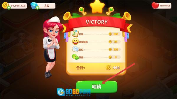 4、关卡结束后会弹出【VICTORY】的提示,接着可以看到【合计-464金币】的奖励,点击【继续】按钮就能进入下一个关卡。