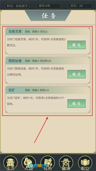 3、在任务界面,你可以接取【培育灵草】【照顾幼兽】【挖矿】这三类任务,完成每个任务需要消耗1个月的时间,通过完成这些任务能够获取贡献值与各类资源,从而为前期的发展提供助力。