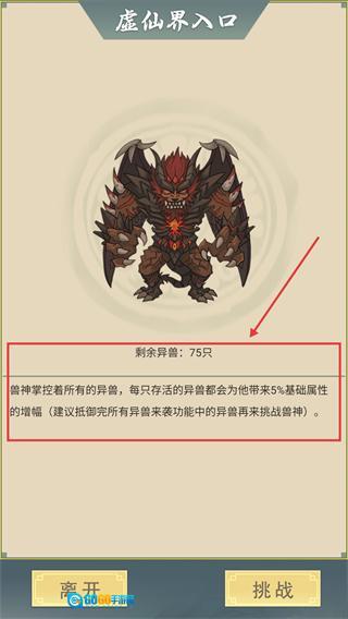 在挑战虚仙界入口的兽神之前,建议先应对【剩余异兽75只】的异兽来袭事件,通过减少它们带来的属性增幅,从而降低后续挑战的难度。