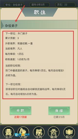4、目前身份是【杂役弟子】,要晋升为【外门弟子】以享受更优渥的福利,需达成积累【3点贡献】和修为提升至【筑基初期一重】这两个条件。