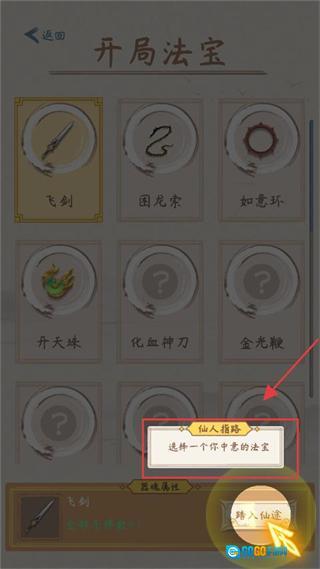2、在法宝选择界面挑选你心仪的【飞剑】-【困龙索】等法宝,选定后点击踏入仙途,继续你的修仙之旅。