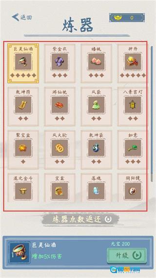 4、在炼器界面选择【巨灵仙酒】-【紫金衣】这类道具,消耗元宝进行升级,以此提升战斗属性,助力修仙进程。