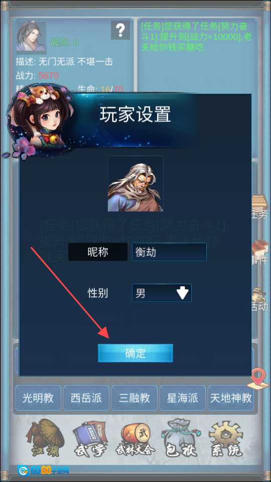 3、进入玩家设置界面后,填写【昵称】,选择性别,再点击【确定】按钮,即可完成角色设置。