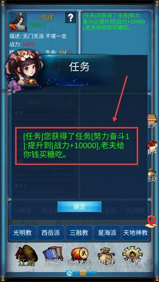 1、承接【努力奋斗1】任务,目标是将战力提升至【10000】,完成任务或参与战斗均可快速提升战力。