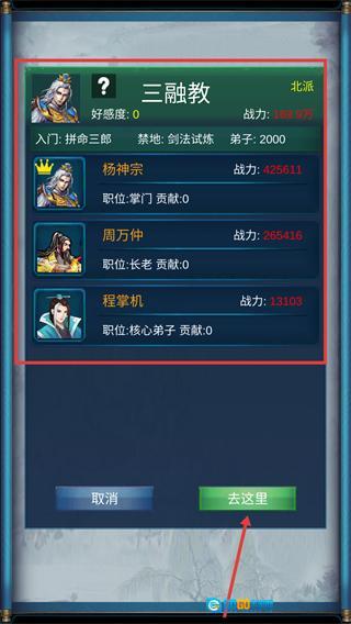 3、前往【三融教】,查看门派成员【杨神宗】【周万仲】,点击【去这里】进入门派完成任务。