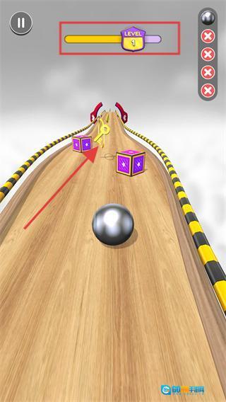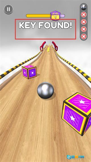 1、在【LEVEL-1】关卡里,通过滑动操作控制【球体】,收集赛道上的【钥匙】,以此推进关卡进度条。