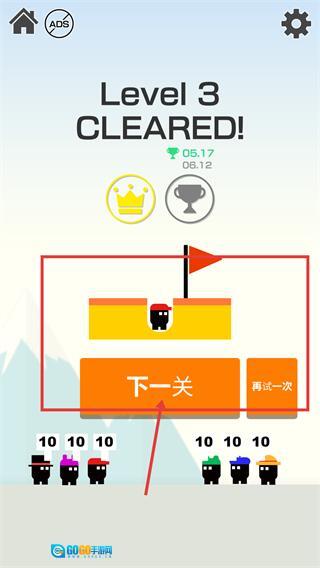 4、当达成【Level-3 CLEARED!】后,点击被红色框选的【下一关】按钮,即可开启后续的摆动挑战关卡,至此本次关卡成功通关。