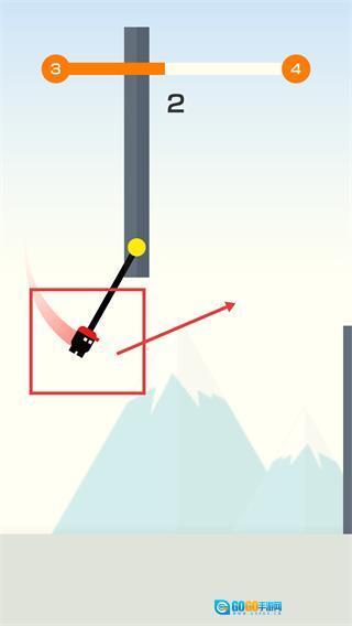 3、持续操控被红色框选的角色进行摆动,利用绳索的惯性使其荡向目标区域,此时关卡进度会更新为【2】,距离通关条件更近一步。