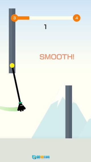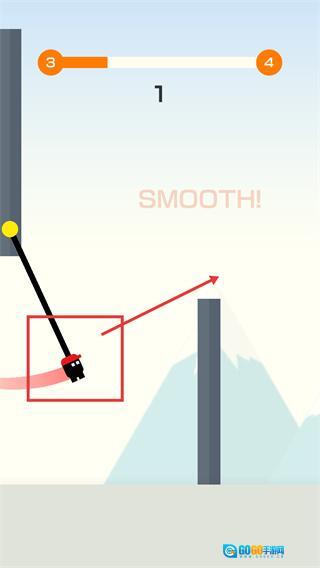 2、进入关卡后,操控被红色框选中的角色,按照箭头指示的方向荡向右侧的柱子,完成摆动的衔接动作,此时界面会显示【SMOOTH!】提示,以此推进关卡进度。