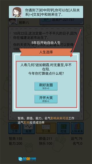 在人生面临选择的阶段,你可以选择【刷朋友圈】——这会让你的【快乐值增加5点】,也可以选择【开怀大笑】——这能使你的【颜值提升6点】,你可以根据自身需求去提升相应的属性,以此来推动人生进程。