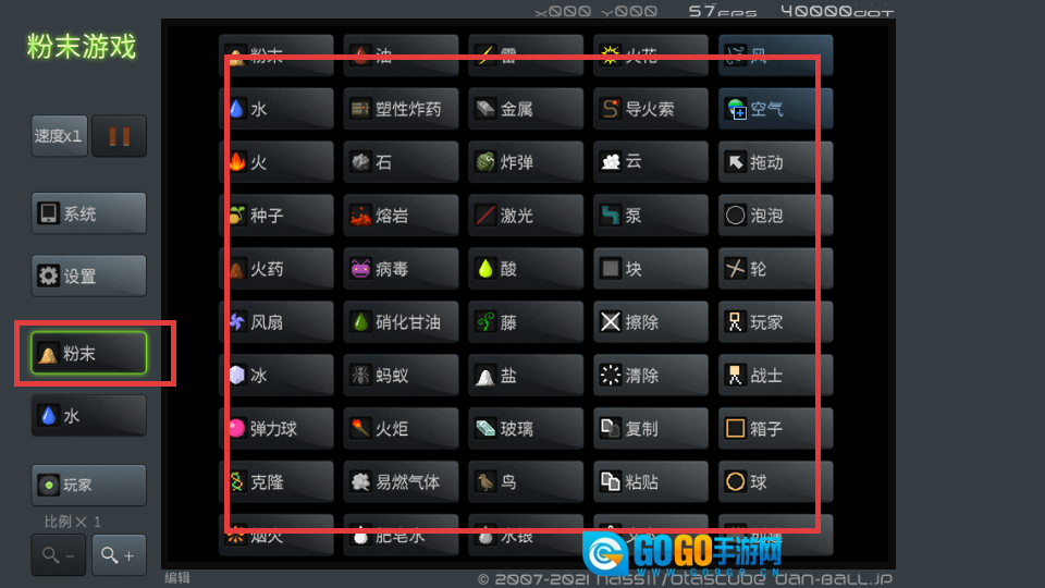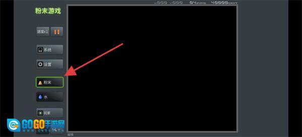 2、进入编辑模式后,点击左侧的【粉末】按钮并选中该元素,即可在场景里添加粉末类物质。