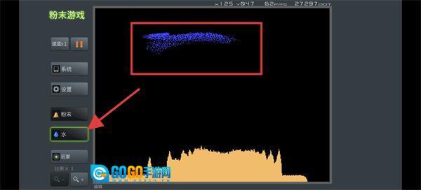 4、点击左侧的【水】按钮以选中该元素,随后在场景内添加水,观察水与粉末等元素之间产生的互动反应。