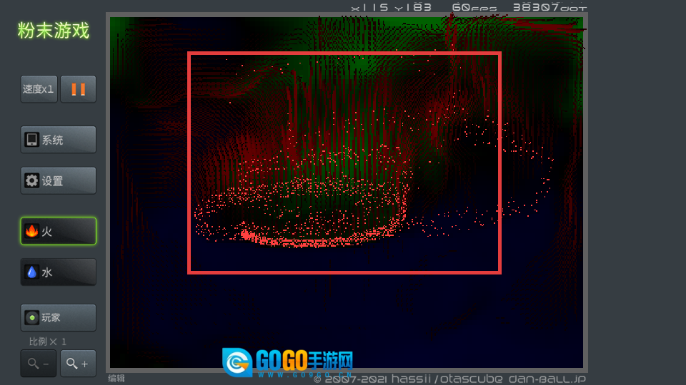 3、点击左侧的【粉末】栏目,挑选火焰、水流等不同元素,把它们拖拽到画布上,以此来构建实验场景。