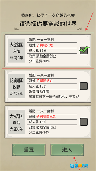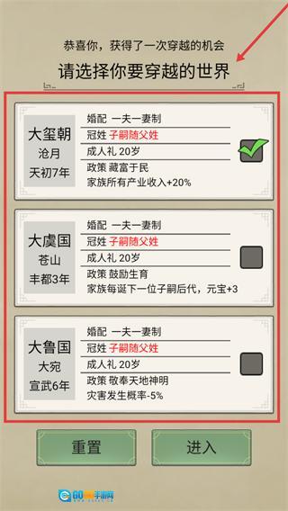 2、在选择穿越世界时,建议优先考虑【大玺朝】,那里有家族产业收入增加20%的政策,能帮助我们在初期快速积累财富与资源。