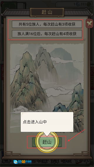 3、当族人数量达到5位时,点击【赶山】可获得3项收获;族人数量满16位后,收获会增加到4项。大家可以通过合理扩大族群规模来提升收益。